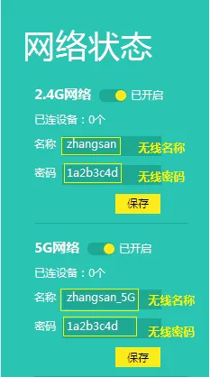 2、在“路由设置”下的“无线设置”选项中,您可以分别设置2.4G频段和5G频段的无线密码及名称,完成后点击保存。