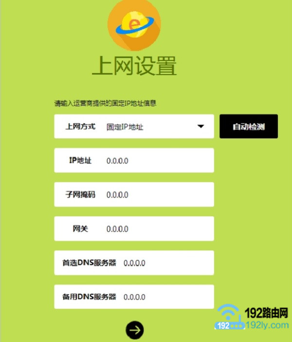 此时请在“上网方式”选择:固定IP地址——>然后填写宽带运营商提供的IP地址、子网掩码、网关和DNS服务器地址——>点击:箭头。