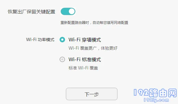 5、在后续页面开启“恢复出厂保留关键配置”选项,选择“Wi-Fi穿墙模式”,然后点击“下一步”,如下图所示。
