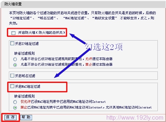 第二步:登录成功后,点击左侧菜单中的“安全设置”——> “防火墙设置”,确保勾选了“开启防火墙”以及“开启MAC地址过滤”这两项,并点击保存按钮。