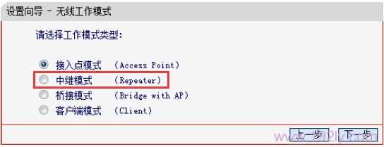3、选择“中继模式(Repeater)”——>点击“下一步”。