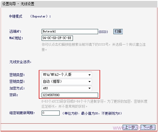 6、“密钥类型”选择:WPA/WPA2-PSK-个人版——>“密钥类型”选择:自动——>“加密方式”选择:AES——>设置“密码”——>点击“下一步”。