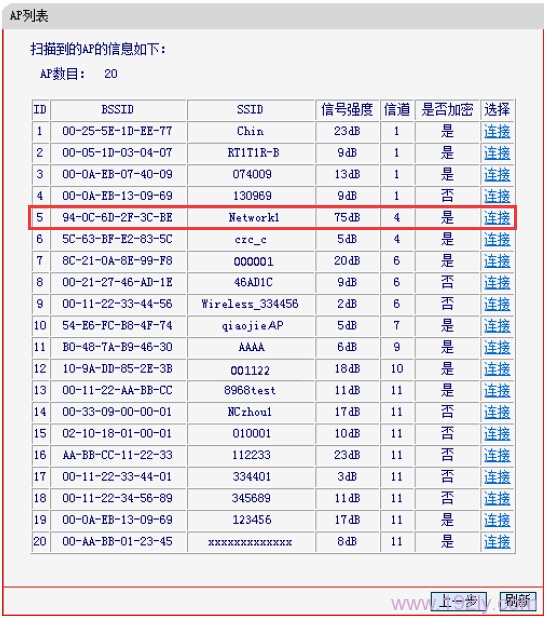5、在扫描结果中,找到主路由器的无线信号名称(本例为:Network1)——>点击“连接”。