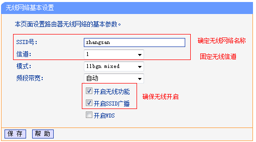1、进入主路由器A的管理界面后,依次点击“无线设置”——>“基本设置”——>填写“SSID号”,注意SSID名称避免使用中文——>在“信道”选项中选择:1——>勾选“开启无线功能”以及“开启SSID广播”——>最后点击“保存”按钮。