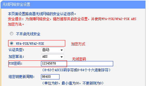2、继续点击“无线设置”——>“无线安全设置”——>选择“WPA-PSK/WPA2-PSK”加密方式——>设定“PSK密码”——>完成设置后点击下方的“保存”按钮。