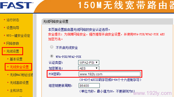 2、进入管理页面后,依次点击“无线设置”——>“无线安全设置”——>找到“PSK密码”,这里显示的就是当前无线路由器的WiFi密码。