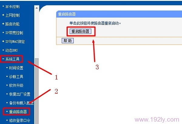 完成设置后,建议重启路由器以使更改生效。可以通过拔掉电源再接通的方式重启,或者直接在设置界面点击重启按钮,如下图所示: