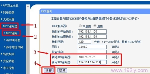 2、导航至“DHCP服务器”下的“DHCP服务”选项——> 在“首选DNS服务器”处填入:180.76.76.76——> “备用DNS服务器”处填入:114.114.114.114——> 点击“保存”按钮。