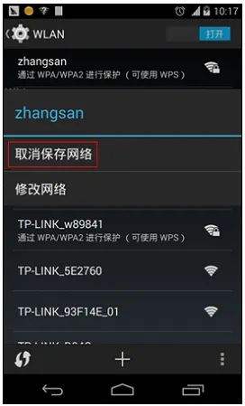 进入WLAN设置页面后,找到并长按需要删除的WiFi网络(例如:zhangshan),随后在弹出的选项中选择:取消保存网络(或:不保存网络)。这样即可从安卓手机中移除该WiFi信号的相关配置文件。