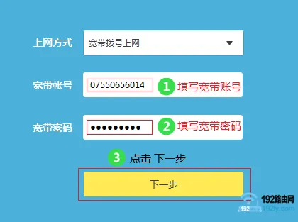 一般来说,路由器会自动检测“上网方式”。如果检测结果显示为“宽带拨号上网”,则需要在此处填写“宽带账号”和“宽带密码”,如下图所示。