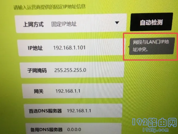 在路由器的设置页面中,出现了“网段与LAN口IP地址冲突”的提示,具体如图所示。