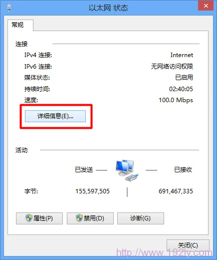 (5)在弹出的窗口中找到“默认网关”这一项,其后的地址即为路由器的IP地址。