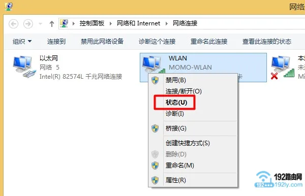(3)在网络连接设置页面里,右键点击“以太网”或者“WLAN”,然后选择“状态”选项。