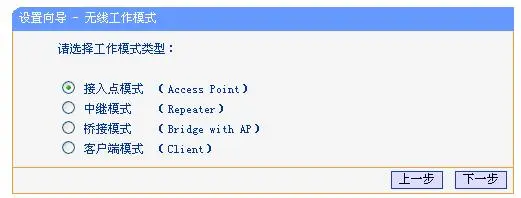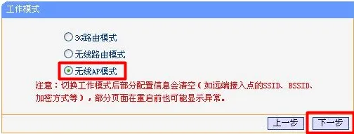3、设定工作模式:在“工作模式”选项中选择“无线AP模式”–>点击“下一步”。
