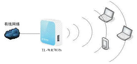 通过网线将TL-WR703N连接至有线网络,它可以与网络中的路由器或交换机相接。例如,在酒店或宾馆的房间内,只需将TL-WR703N插入房间内的网络接口即可。随后进行必要的配置,便可将原本的有线网络转化为支持无线连接的形式。