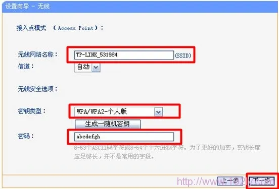 5、无线设置:“无线网络名称”可根据个人喜好自定义–>“密钥类型”推荐选择“WPA/WPA2”–>“密码”自行设定(示例为abcdefgh)–>“下一步”。