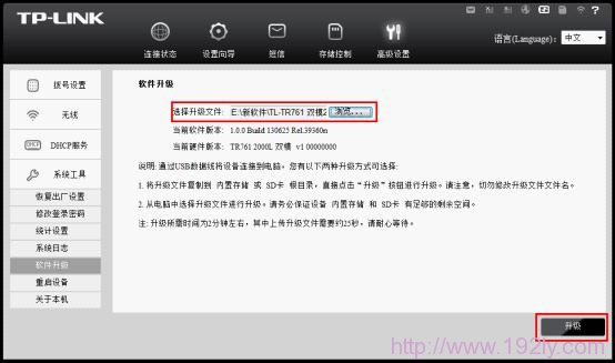 3、开始升级操作:点击“高级设置”里的“系统工具”中的“软件升级”,点击“浏览”按钮,选择“update.zip”文件后点击“升级”。