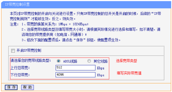 2、导航至“IP宽带控制”模块,选择“宽带线路类型”为ADSL线路(若非ADSL,请选择相应选项);接着在“上行总宽带”处填入512,“下行总宽带”处填入4096,最后点击“保存”按钮。