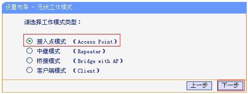 选择“接入点模式(Access Point)”——>点击“下一步”。