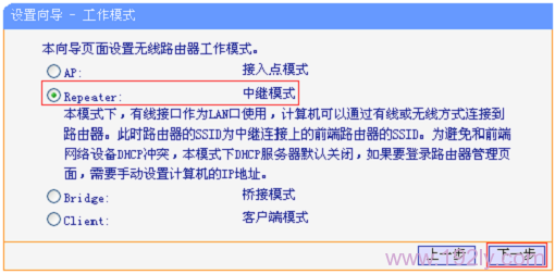 2. 选择工作模式:在这里需要选择“Repeater: 中继模式”——>点击“下一步”。