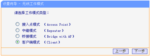 2、选定工作模式:在此处选择“客户端模式(Client)”——>点击“下一步”。