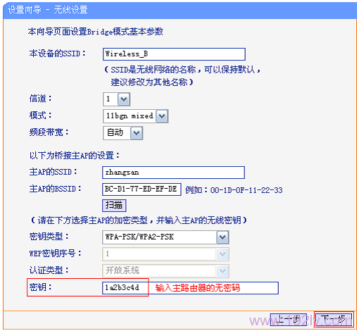 5、设置无线密码:“密钥类型”选择:WPA-PSK/WPA2-PSK——>设定“密钥”(“密钥类型”和“密钥”应与被桥接的无线信号相同)。