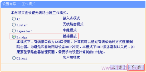 TL-WR800N的工作模式选择“Bridge:桥接模式”