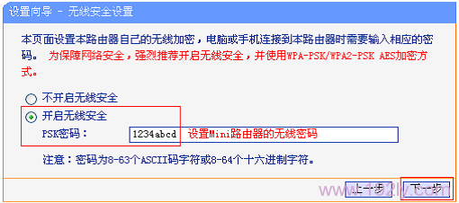 6、设置TL-WR800N无线密码:勾选“开启无线安全”——>设定“PSK密码”——>点击“下一步”。