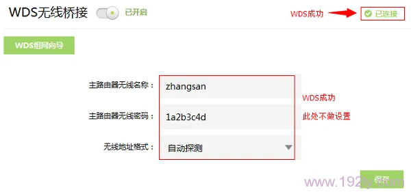 小贴士:如果您希望更改无线SSID和密码,请注意这样会导致WDS桥接后出现两个不同的无线网络名称。因此,除非有特殊需求,否则建议保持默认设置不变。