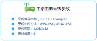 首先访问主路由器的管理页面,记住以下几项内容:无线网络名称、加密类型及密码,本文将以这些示例参数为例进行说明。