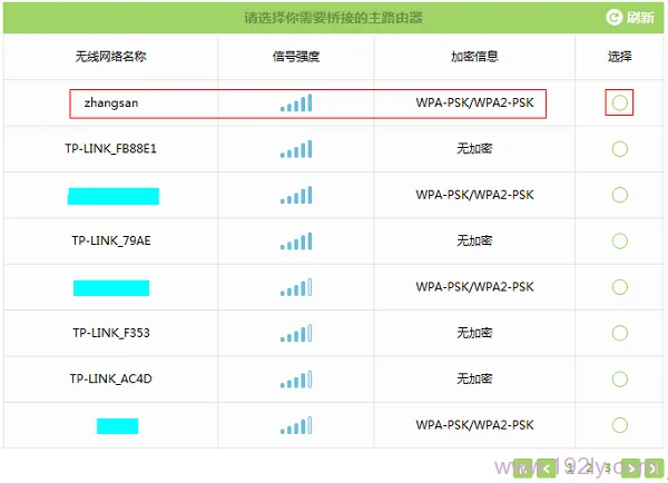 (2)TL-WR842+路由器会自动扫描周边的无线信号源,从中选定主路由器的SSID(例如:zhangsan),然后点击“选择”。如下图所示: