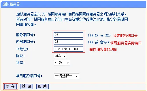 填写邮件服务器的“服务端口号”(对外开放端口)——>“内部端口号”(服务器实际端口)——>“服务器IP地址”——>最后点击“保存”。