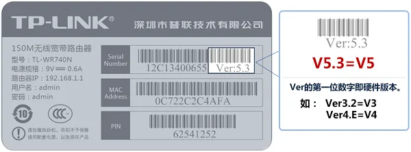 如何确认TL-WR886N路由器的具体版本呢?您可以查看路由器底部标签上的Serial Number栏中的 Ver(即Version/版本)标注,以此来判断硬件版本。如下图所示: