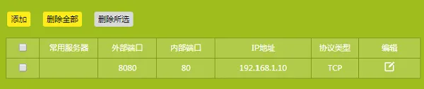 从“常用服务器”列表中选择“HTTP”——>在“外部端口”处填写“8080”——>在“内部端口”处填写“80”——>在“IP地址”处填写“192.168.1.10”——>最后点击“保存”按钮。