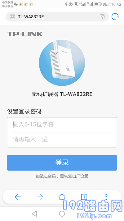 打开手机上的浏览器,在地址栏输入:tplogin.cn 打开设置界面——>并根据页面提示,为扩展器设置一个管理员密码(登录密码),如下图所示。