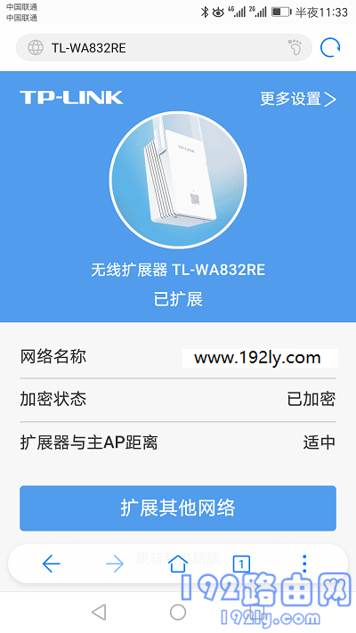 4、此时,TP-LINK无线扩展器会自动扩展主路由器的无线信号。