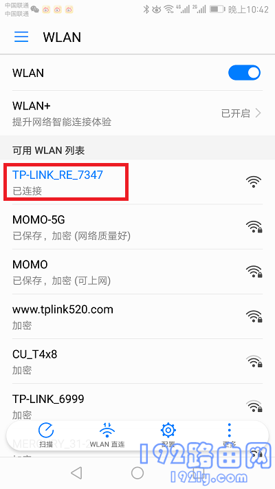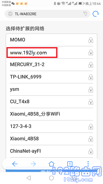 本文中,鸿哥使用www.192ly.com作为演示的主路由器无线名称,因此需要选择www.192ly.com这个无线信号。