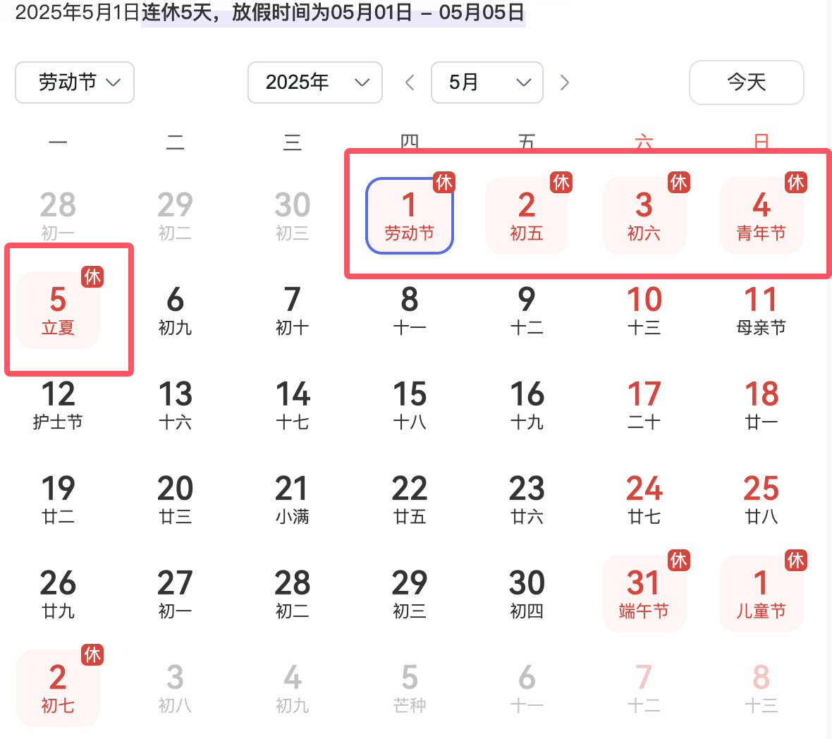 放假时间:5月1日(周四)至5月5日(周一)共5天,其中: