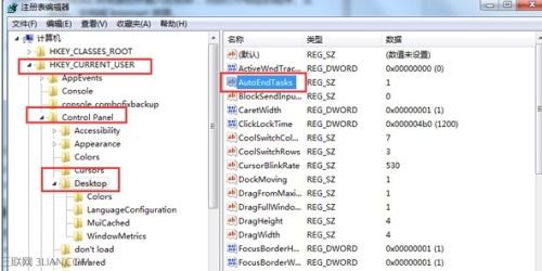 2.在打开的注册表编辑器窗口中,咱们依次点击展开左侧菜单中的HKEY_CURRENT_USERControl PanelDesktop项,然后在右侧窗格中找到中“AugoEndTasks”项,然后双击打开该项,在弹出来的编辑窗口中,咱们将AugoEndTasks修改为1,点击确定保存设置就可以了。
