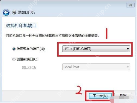 7、选择打印机的端口类型(图中1),通常可以在说明书中找到,然后点击“下一步”(图中2)。