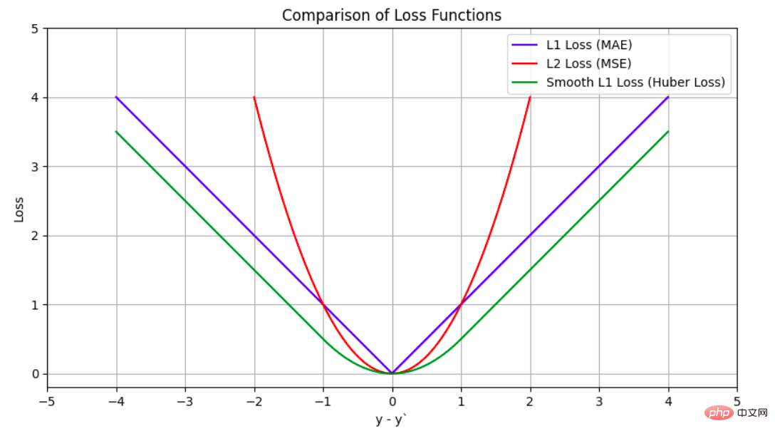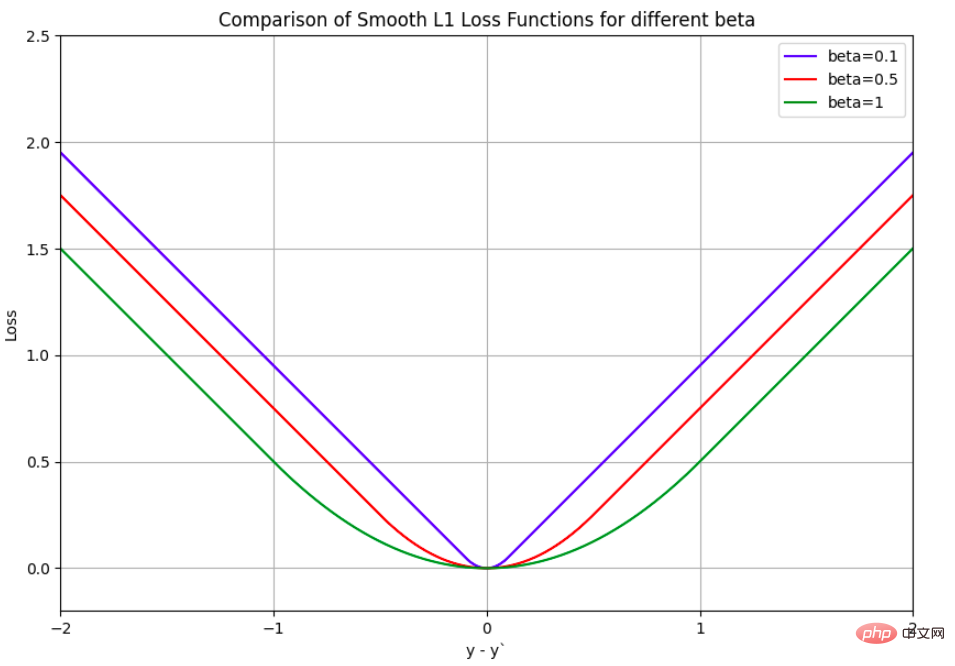 分类任务中最流行的损失函数是交叉熵损失,回归任务中最流行的损失函数是 L1 或 L2 (MSE) 损失。但是,为了在模型训练期间保持数值稳定性,可以使用某些变体。例如,在 Pytorch 中,BCEWithLogitsLoss 将 S 型层和 BCELoss 合并为一个类,并使用对数和指数技巧,这使其比 S 型层后跟 BCELoss 更具有数值稳定性。另一个示例是 SmoothL1Loss,它可以看作是 L1 和 L2 损失的组合,并使 L1 损失平滑接近于零。但是,使用平滑 L1 损失时必须小心,以适当设置 beta,因为其默认值 1.0 可能不适合在正弦和余弦域中回归值。下图显示了 L1、L2 (MSE) 和平滑 L1 损失的损失值以及不同 beta 值下平滑 L1 损失值的变化。